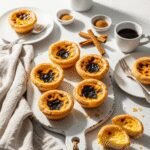 These Portuguese egg tarts feature flaky, buttery puff pastry shells filled with creamy vanilla custard. Baked until golden with caramelized spots on top, they’re the perfect balance of crispy and creamy – just like the famous Pastéis de Nata from Lisbon bakeries.