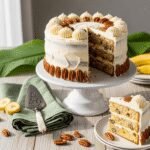 Press the toasted chopped pecans around the sides of the cake or sprinkle them on top for decoration. If you want to get fancy, you can pipe frosting rosettes on top or add fresh banana slices just before serving (they’ll brown quickly, so don’t add them too far in advance). Refrigerate the cake for at least 30 minutes to set the frosting before slicing.